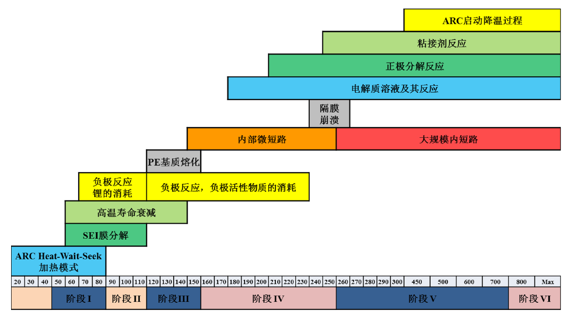 圖1 絕熱熱失控測試各個階段發(fā)生的化學(xué)反應(yīng)情況