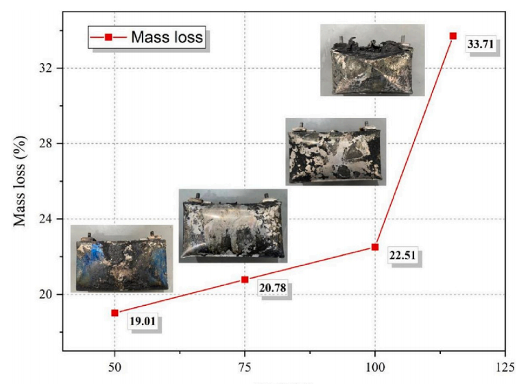 對熱失控后的電池殘骸進(jìn)行稱量,可計算質(zhì)量損失率。該方法同樣能夠判斷電池?zé)崾Э貏×页潭?。從圖2可以發(fā)現(xiàn),SOC越高,電池的質(zhì)量損失率越大,這是由于高SOC的電池在熱失控過程中通常伴隨更強(qiáng)烈的電池材料噴發(fā)、起火和燃爆現(xiàn)象。