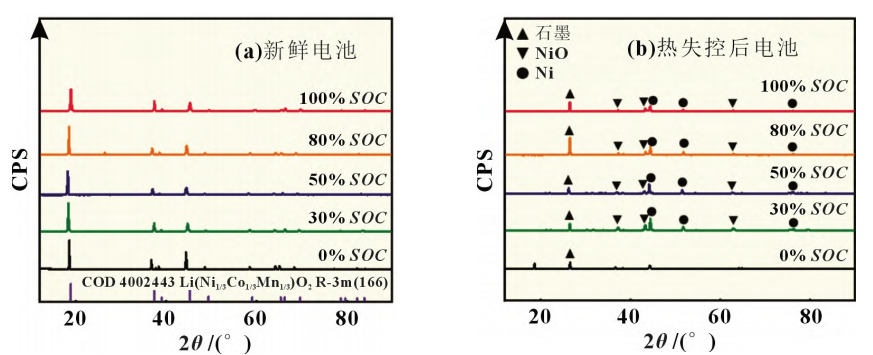 以上研究說明高電量更容易導(dǎo)致電池?zé)崾Э氐陌l(fā)生,且熱失控劇烈程度會更高、燃爆現(xiàn)象更明顯。上?;ぱ芯吭簝Φ马g等[3]研究認(rèn)為正極材料的熱分解是電池?zé)崾Э氐闹匾襟E,也是導(dǎo)致高電量電芯更易失控的原因之一,為此他們使用了XRD對熱失控前后正極材料的晶體結(jié)構(gòu)進(jìn)行了分析。