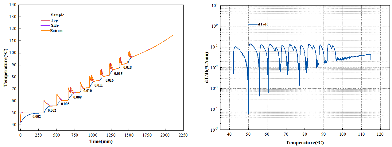 規(guī)避鋰電池?zé)岚踩L(fēng)險(xiǎn)的前提是獲取電池的熱特征參數(shù),從而設(shè)計(jì)相應(yīng)的防護(hù)措施與預(yù)警機(jī)制。目前,行業(yè)內(nèi)主要利用電池絕熱量熱儀(ARC)測(cè)試鋰電池的關(guān)鍵熱參數(shù),該儀器能夠在絕熱狀態(tài)下測(cè)定電池的自發(fā)熱特性,從而獲取電池絕熱熱失控特征參數(shù)或絕熱溫升特性數(shù)據(jù)(GB/T 36276-2023)。