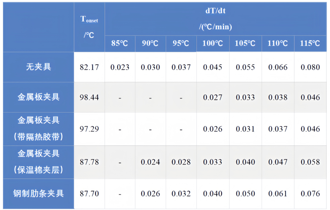 在上述實(shí)驗(yàn)過(guò)程中,電池在高溫下內(nèi)部產(chǎn)氣易發(fā)生鼓脹,通常需要使用夾具固定溫度傳感器,防止由于傳感器虛接或脫落導(dǎo)致測(cè)溫異常,確保測(cè)定數(shù)據(jù)的準(zhǔn)確性。然而,夾具存在一定的熱惰性,實(shí)驗(yàn)過(guò)程中可能會(huì)吸收電池釋放的部分熱量,導(dǎo)致電池溫升速率的檢測(cè)結(jié)果偏低,自放熱起始溫度Tonset等測(cè)定結(jié)果滯后。