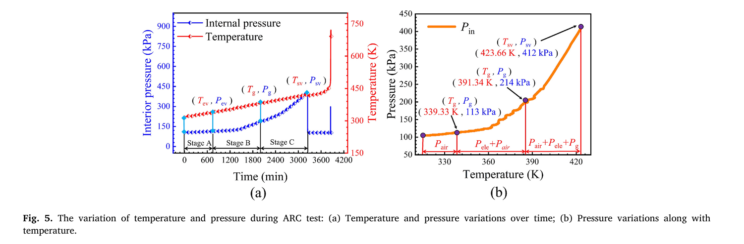 本研究中,團(tuán)隊(duì)使用仰儀科技大型電池絕熱量熱儀BAC-420A,并聯(lián)用壓力傳感器、氣相色譜儀等設(shè)備,針對充滿電的300Ah磷酸鐵鋰電池,對其在熱失控過程中的內(nèi)部壓力變化、氣體釋放情況以及溫度變化展開了詳細(xì)研究。
